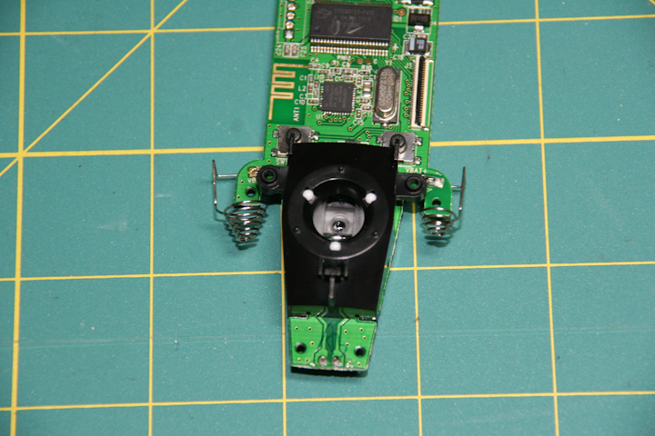 Since there wasn’t enough space under the zoom slider for the circuit board in the keyboard, I had to extend the optical camera along with trackball housing so it would fit under the zoom slider. For that, I de-soldered the optical camera unit and extended it by using a piece of ribbon cable: